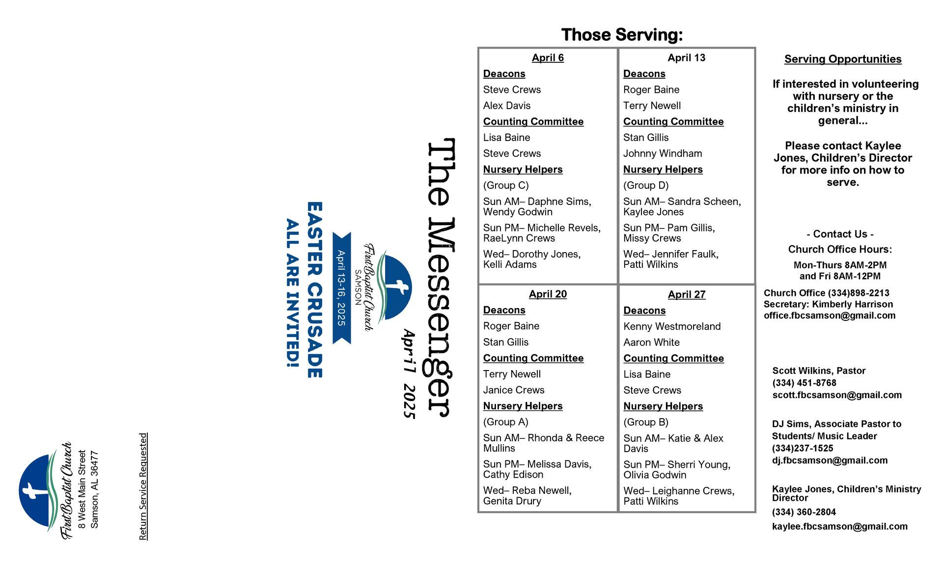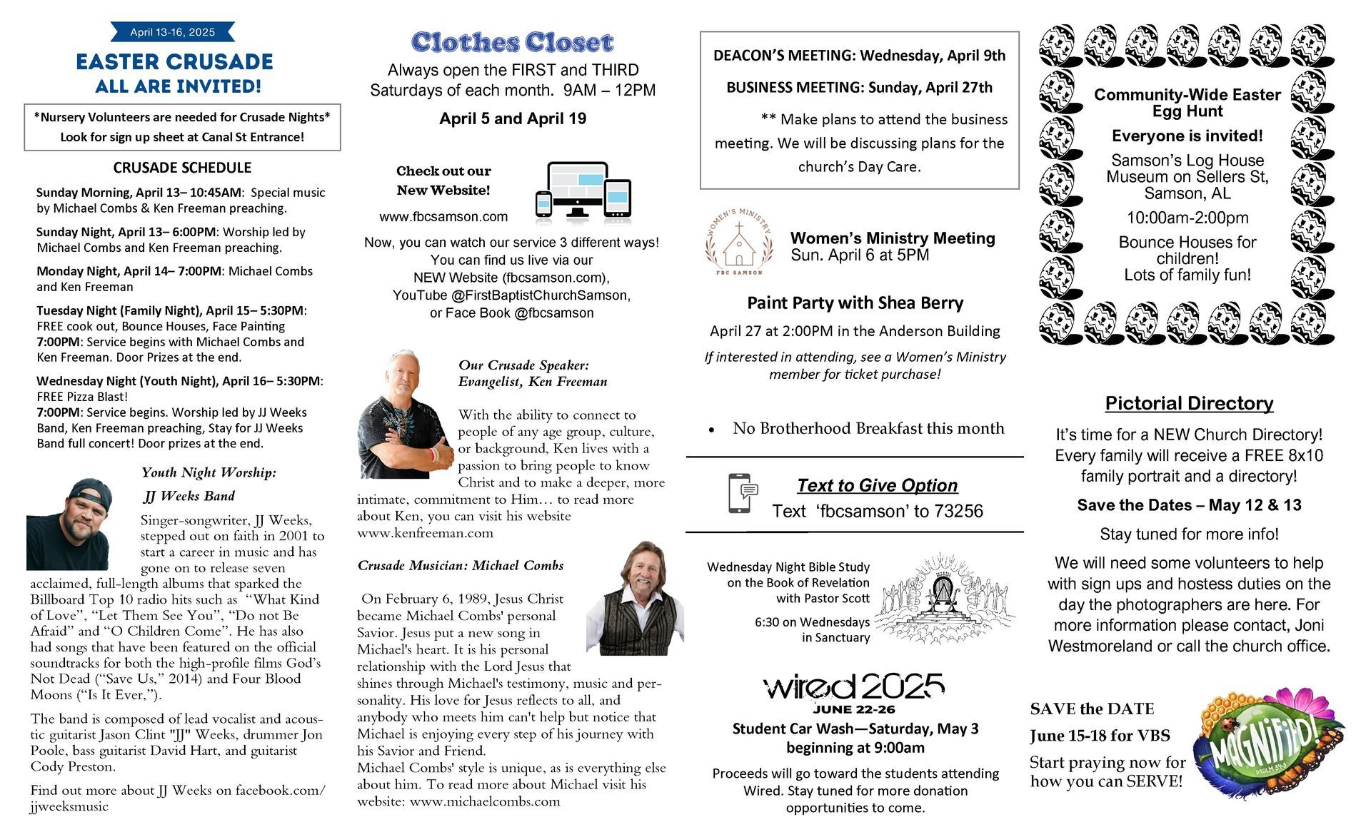 Gather with us on Wednesday and Sundays to worship at FBC Samson.
