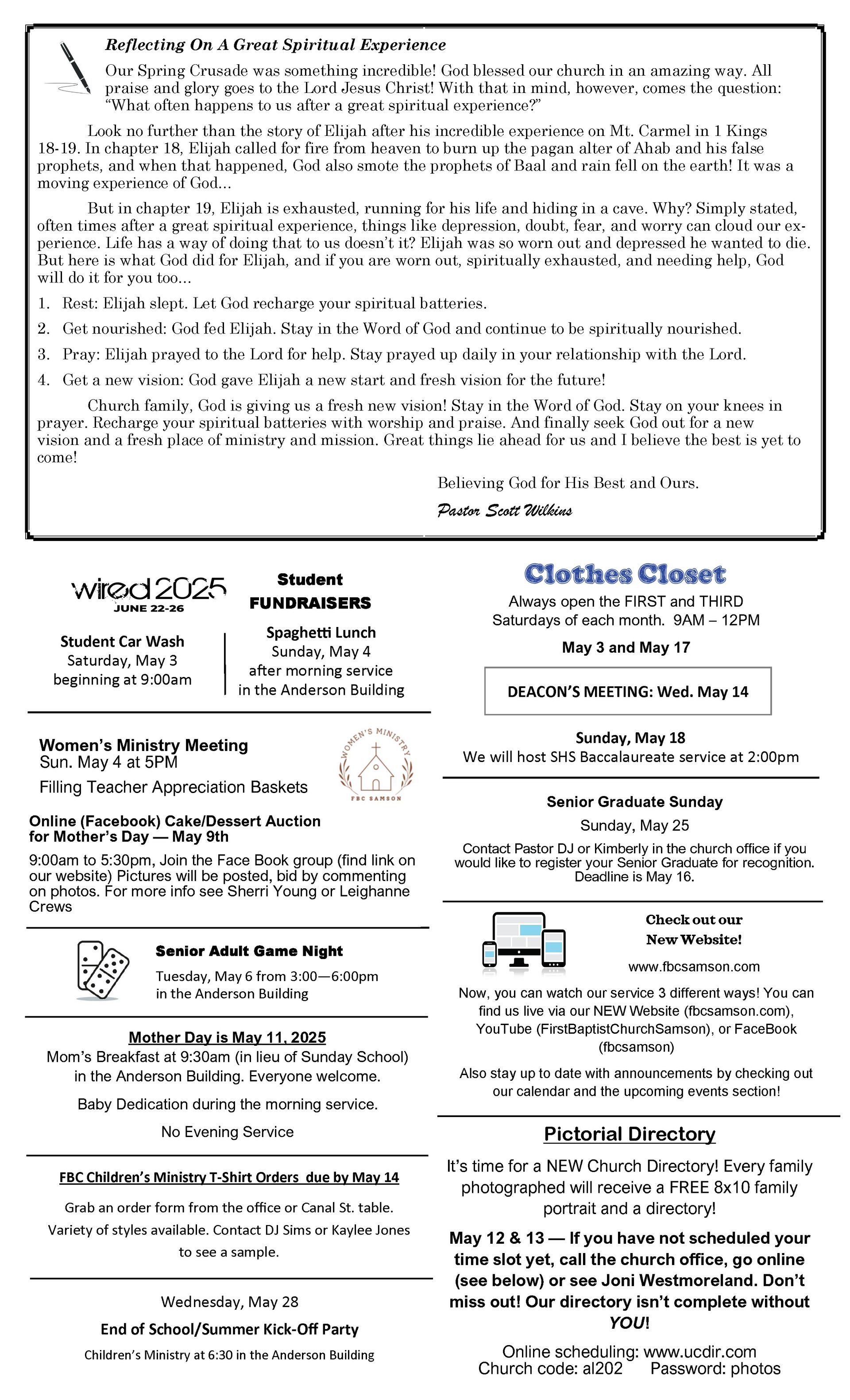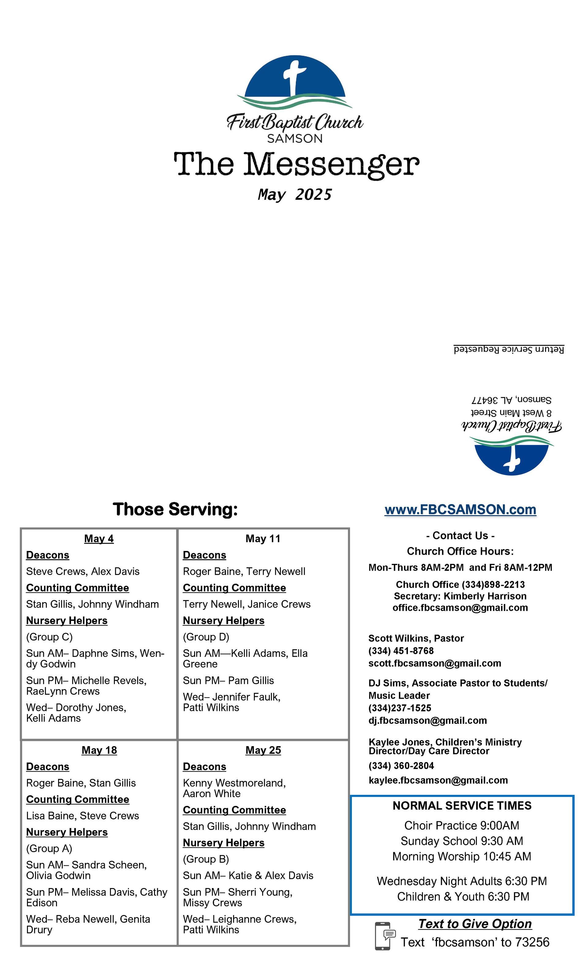 Gather with us on Wednesday and Sundays to worship at FBC Samson.