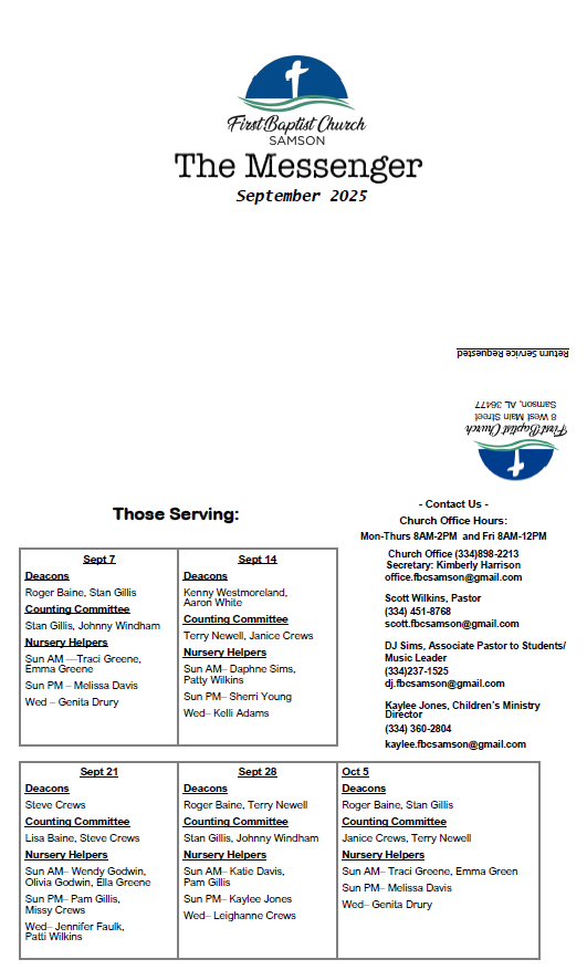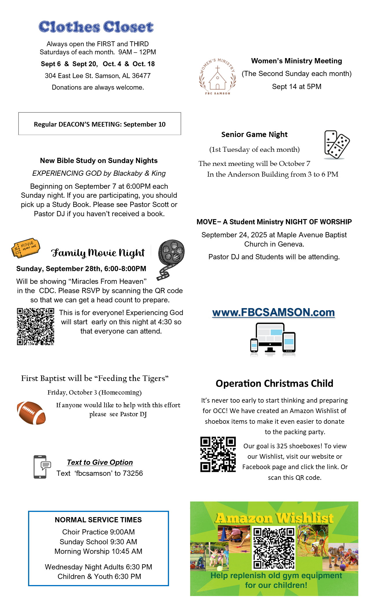 Gather with us on Wednesday and Sundays to worship at FBC Samson.