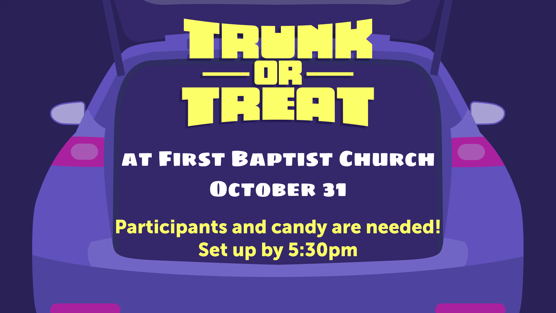 Need participants to sign up for Trunk or Treat. 6-8 on Friday night Oct. 31. Set up by 5:30PM.